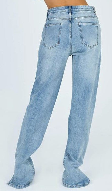 Relaxed fit, medium wash denim jeans. High rise with slits on bottom.